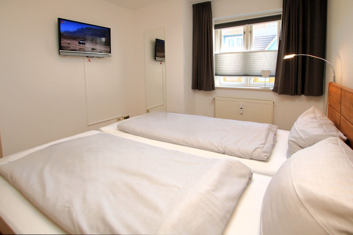 Im SCHLAFZIMMER 1 steht ein Doppelbett und Kleiderschrank (1,80 x 2 m) und SAT/TV. Das SCHLAFZIMMER 2 verfügt über ein Einzelbett (1,70x09m) nur für kleine Personen und einen Kleiderschrank. Beide Zimmer sind mit Parkett ausgelegt. Im Badezimmer befinden sich Dusche und WC.