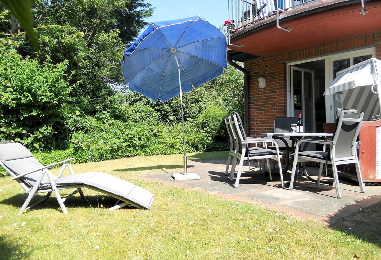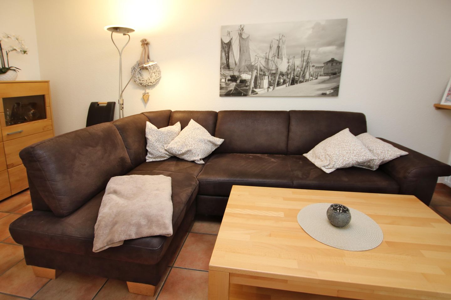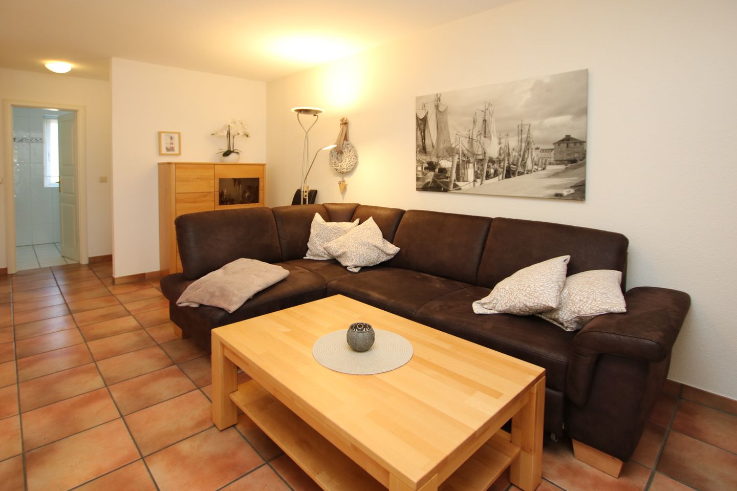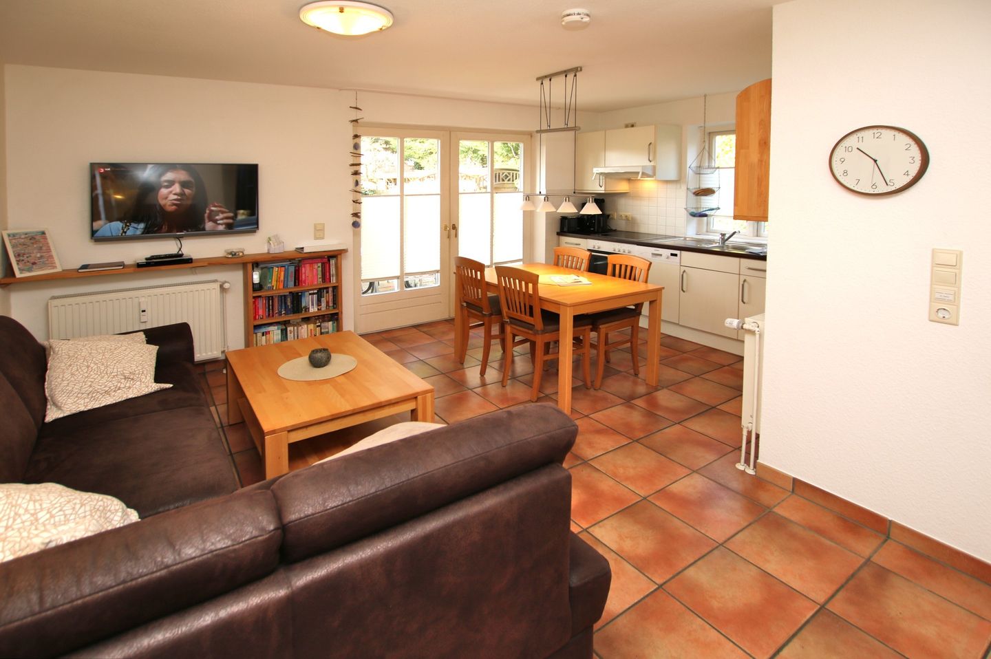 Die helle 3-Zimmer Nichtraucher- Ferienwohnung verteilt sich auf ca. 45 qm im Erdgeschoß mit toller Südterrasse und kleinem Rasenstück. Das WOHNZIMMER ist ausgestattet mit einem gemütlichen Ecksofa und einem Couchtisch. Vom Wohnzimmer haben Sie einen direkten Zugang zur Terrasse mit Strandkorb und Gartenmöbeln.